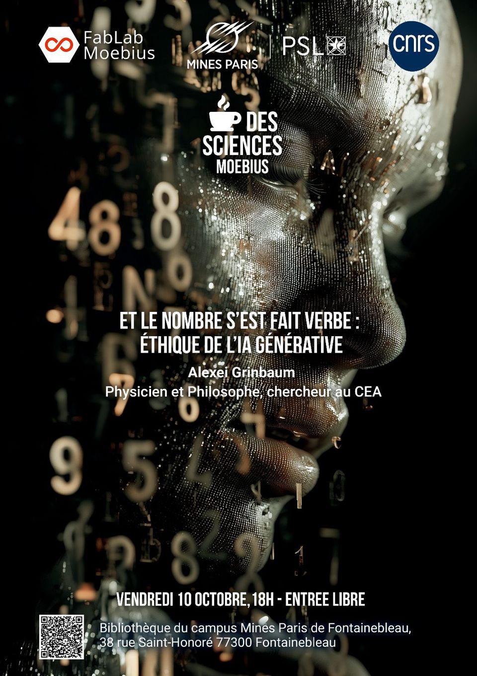 Vendredi 10 octobre à 18h, venez participer au café des sciences – Fablab Moebius Makers sur le thème : « Et le nombre s’est fait verbe : éthique de l’IA générative ». Rendez-vous à la Bibliothèque de l'école des Mines (38, Rue Saint-Honoré).