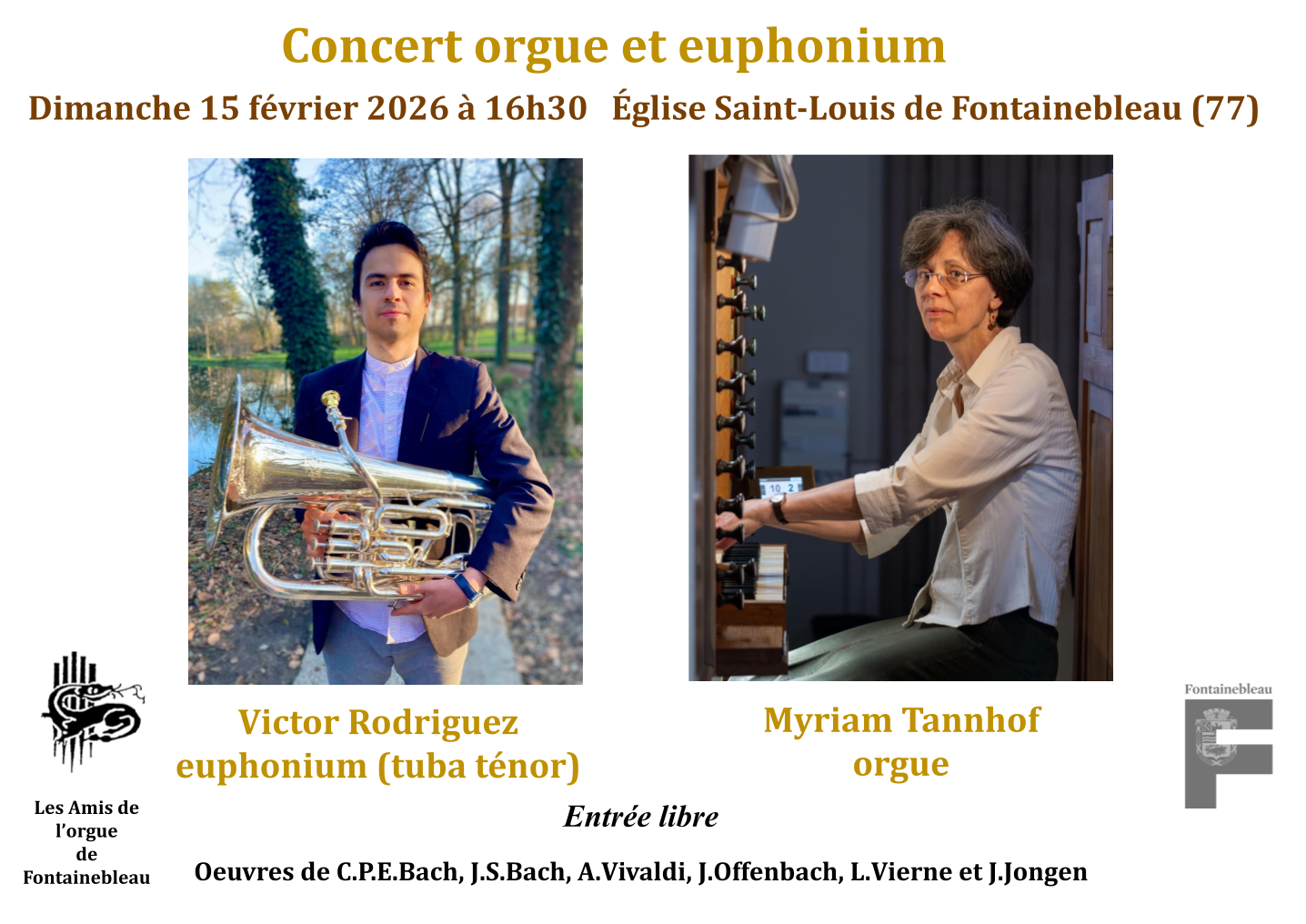 Dimanche 15 février à 16h30, l'association des Amis de l'Orgue de Fontainebleau vous invite à participer à un concert d'orgue et euphonium en l'église Saint-Louis de Fontainebleau (rue de la Paroisse).