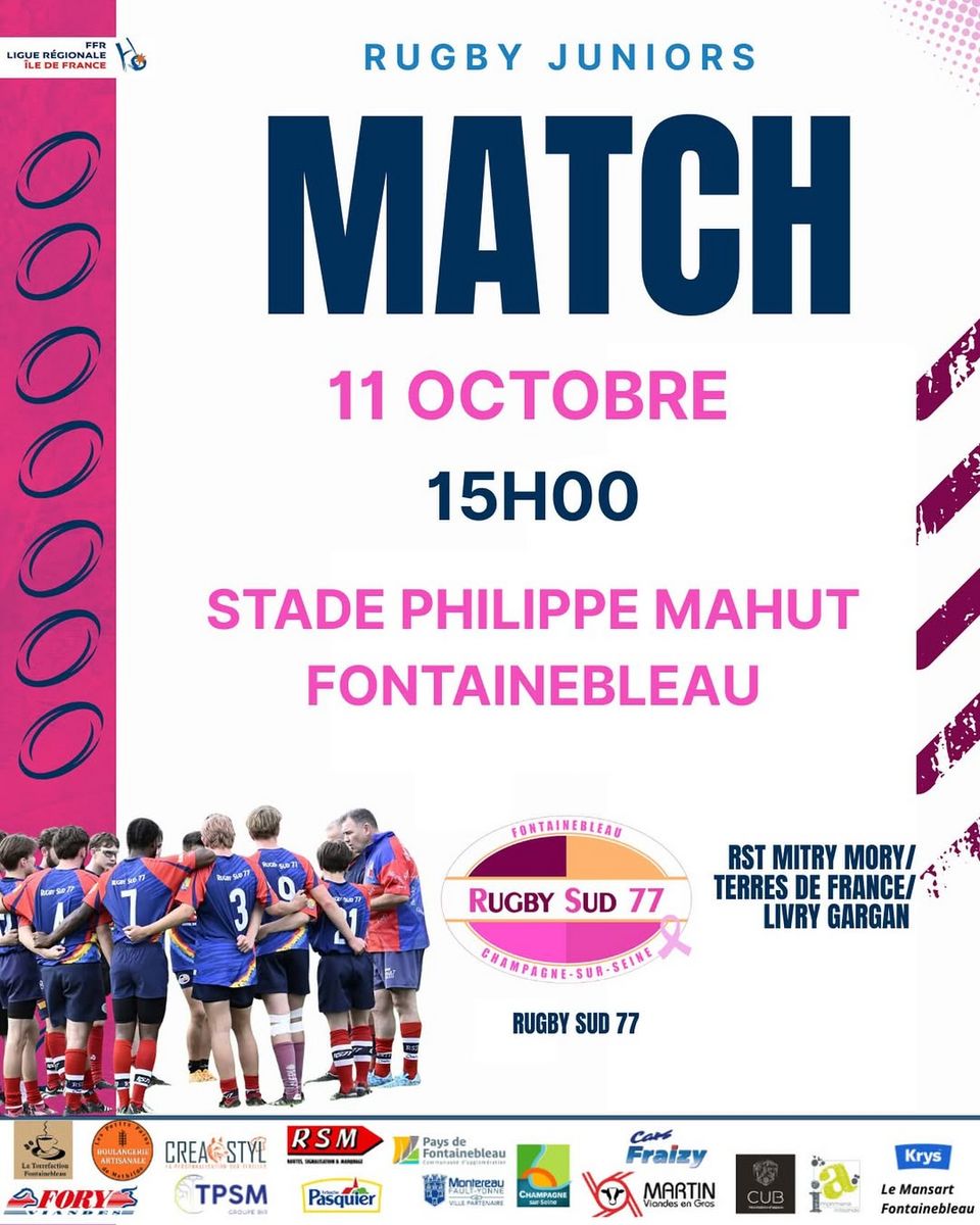 Samedi 11 octobre à 15h, venez encourager les juniors du Rugby Sud 77 lors de leur match au stade P. Mahut.