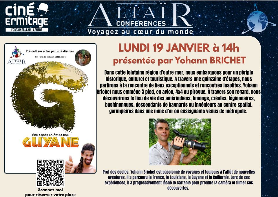 Lundi 19 janvier 2026 à 14h, venez assister à la projection/rencontre du film Guyane, une pépite en Amazonie, présentée par Yohann Brichet et proposée dans le cadre du cycle de projections-conférences ALTAÏR.