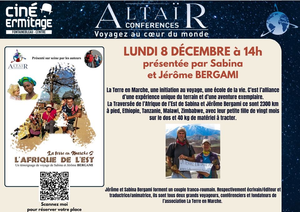 Lundi 8 décembre 2025 à 14h, venez assister à la projection/rencontre du film L'Afrique de l'Est, présentée par Sabrina et Jérôme Bergami et proposée dans le cadre du cycle de projections-conférences ALTAÏR.