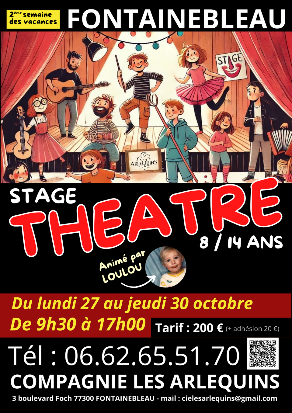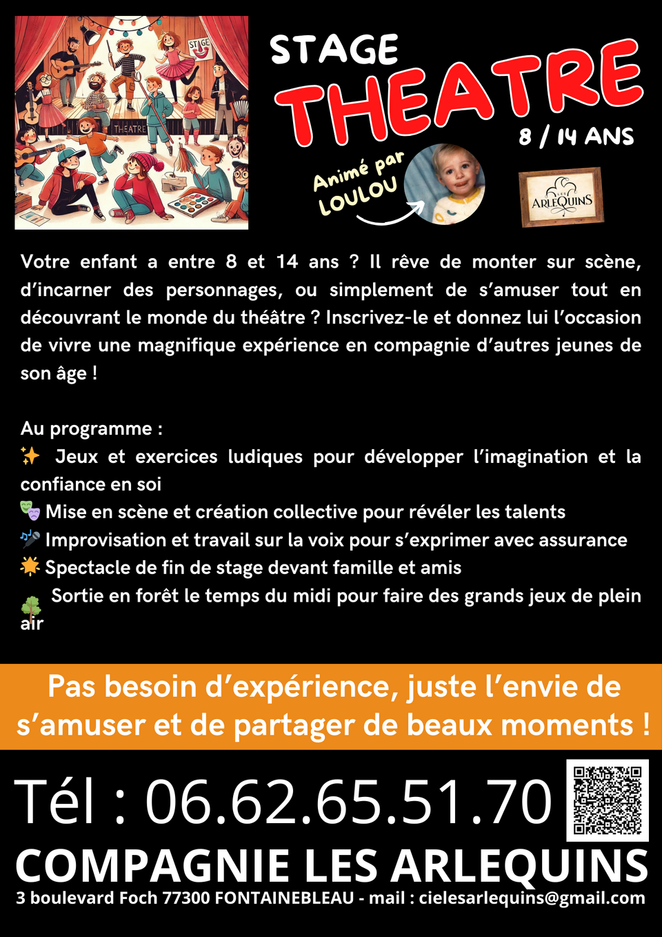 Du 27 au 30 octobre, de 9h30 à 17h, les enfants de 8 à 14 ans sont invités à participer à un stage de théâtre par la Compagnie Les Arlequins, animé par Loulou ! Le stage se tiendra au 3 bd Foch.