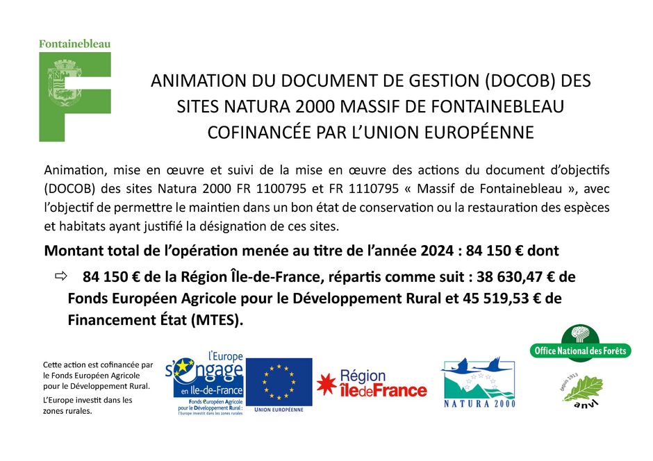 Animation, mise en oeuvre et suivi de la mise en oeuvre des actions du document d'objectifs (DOCOB) des sites Natura 2000 FR 1100795 et FR 1110795 « Massif de Fontainebleau », avec l’objectif de permettre le maintien dans un bon état de conservation ou la restauration des espèces et habitats ayant justifié la désignation de ces sites.