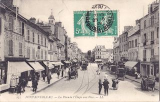 Avant d’être la place que l’on connaît aujourd’hui, elle s’appelait la place de l’Étape aux vins, après avoir accueilli le marché aux porcs. Ce nom, étonnant au premier abord, est pourtant directement lié à l’activité de l’époque. Depuis des siècles, cet axe est un lieu stratégique du commerce local. L’« étape » était un espace où certains produits étaient soumis à un contrôle spécifique. Et lorsque le roi séjournait à Fontainebleau, le vin y était détaxé, ce qui donnait à cette place un rôle commercial de premier plan.