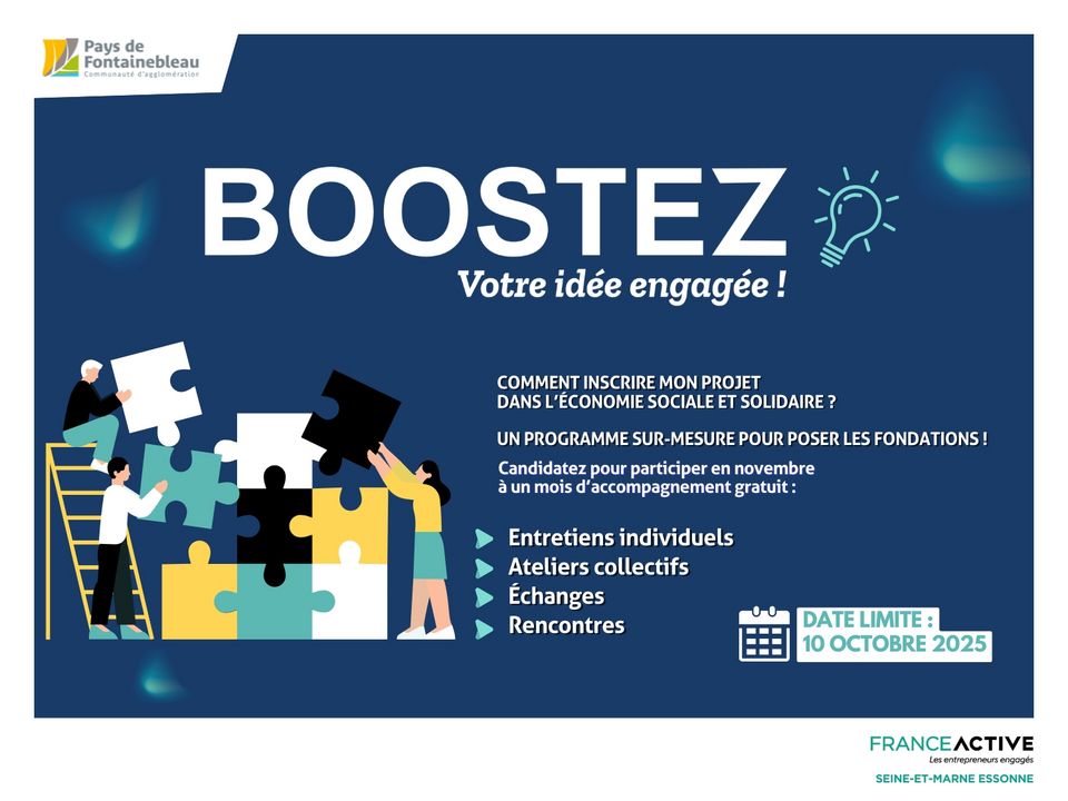 • Candidater : Dépôt de votre dossier de candidature  (formulaire en ligne à compléter et CV à faire parvenir par mail à jeannel@franceactive-seineetmarneessonne.org) jusqu’à 12h00 le vendredi 10 octobre 2025