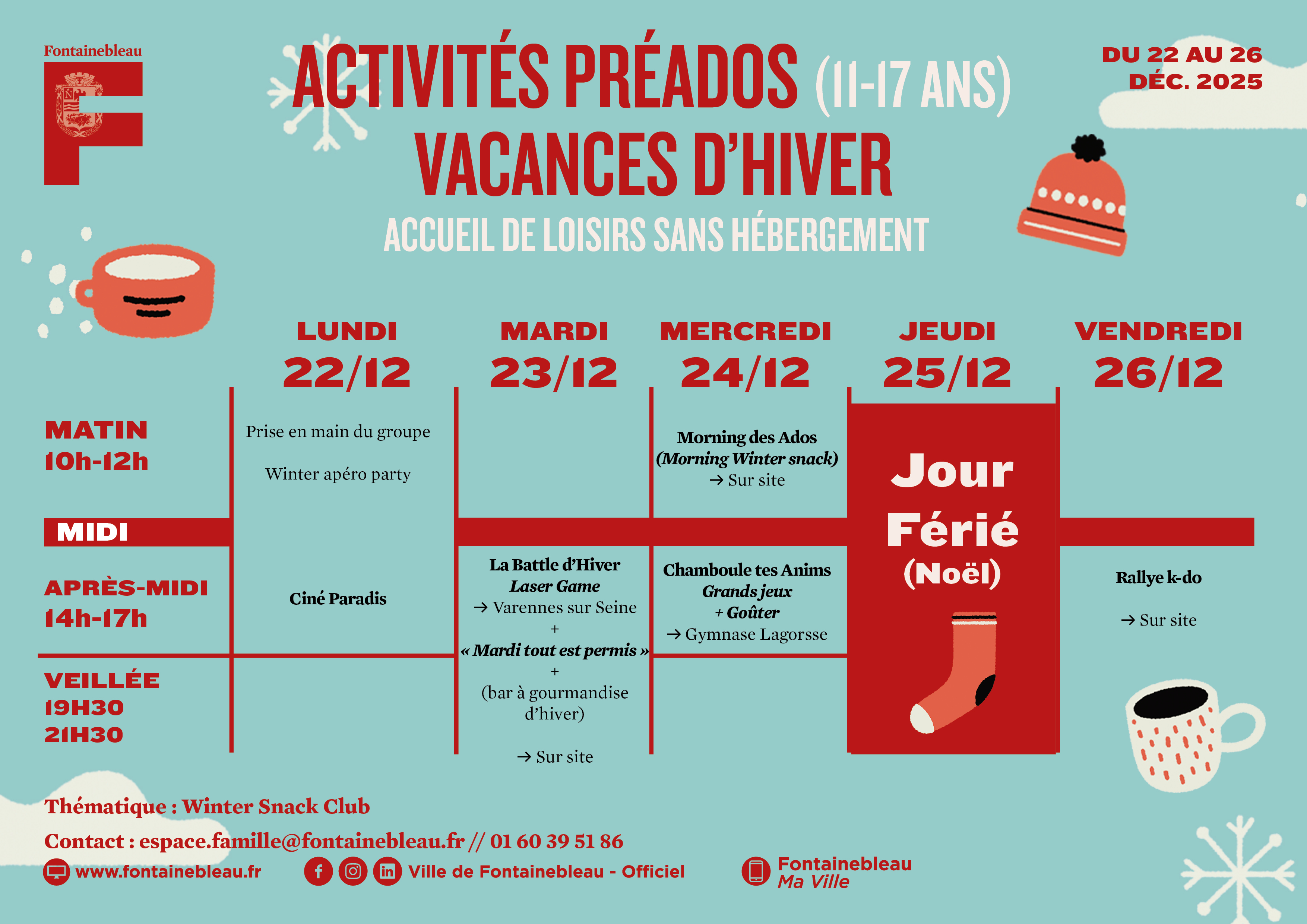 Comme à son habitude, durant les vacances d'hiver (du 22 au 26 décembre 2025), le service Jeunesse de la ville de Fontainebleau propose de nombreuses activités réservées aux pré-ados !